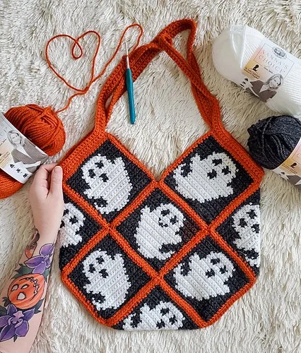 This is definitely not your traditional granny square bag! This bag is made up of squares with a ghost motif, perfect for this spooky season!